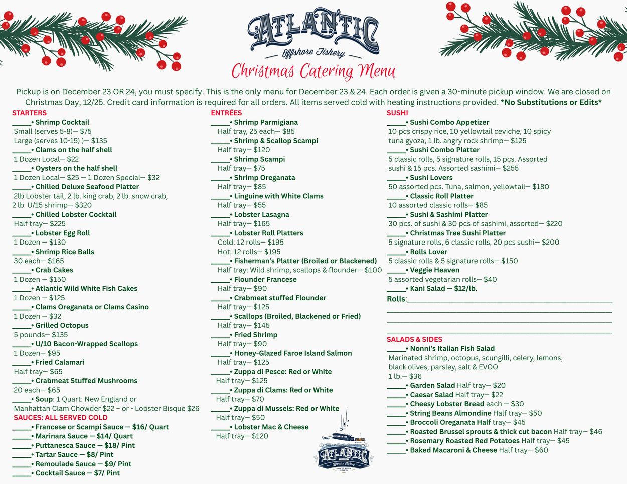 For the month of December, we’ll be featuring the following catering menu! You can place your orders online for pickup or delivery with at least 48 hours’ notice. You’re also welcome to call or visit us for all your holiday needs. Don’t forget to stop by our fish market and explore our frozen offerings for even more seafood options!